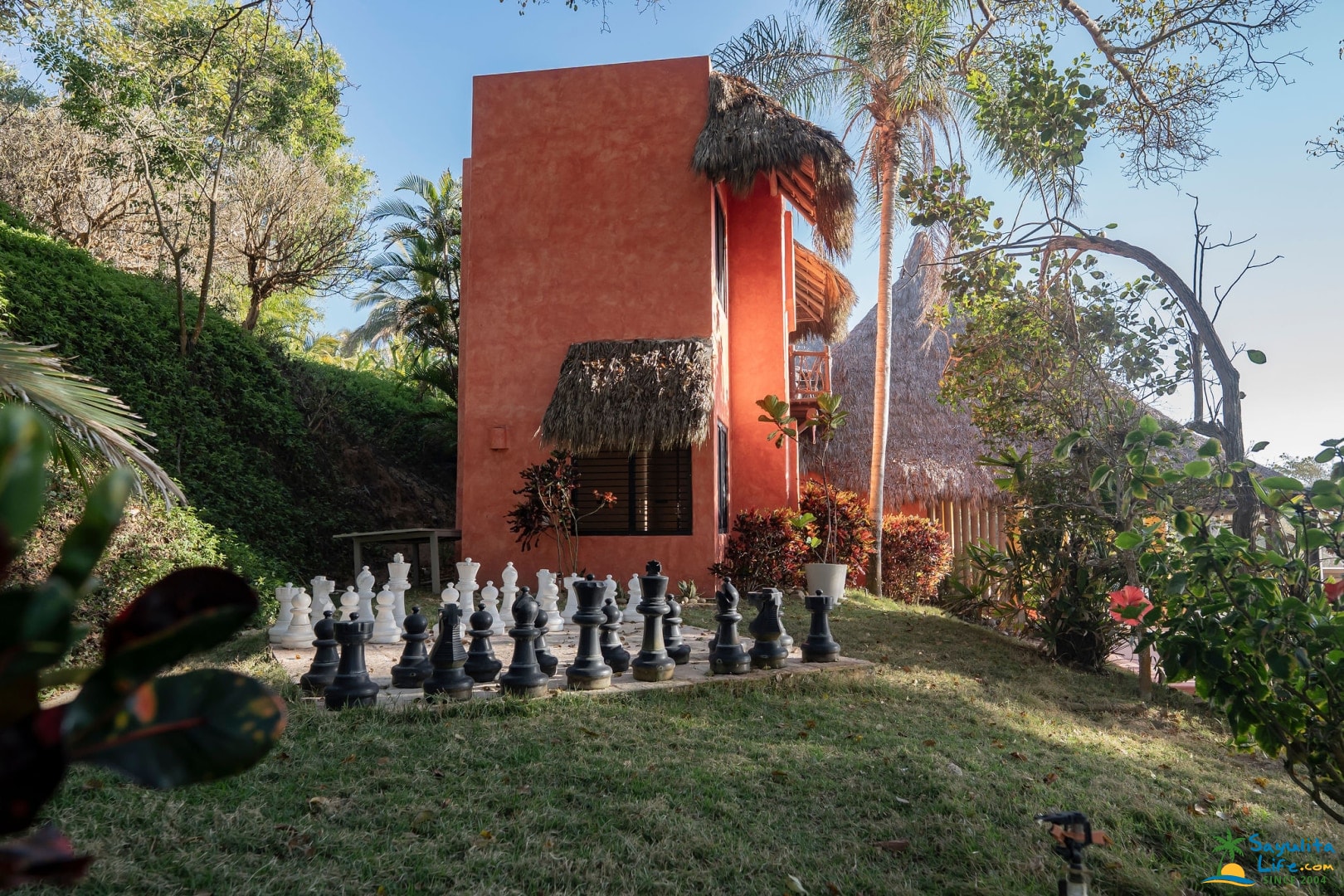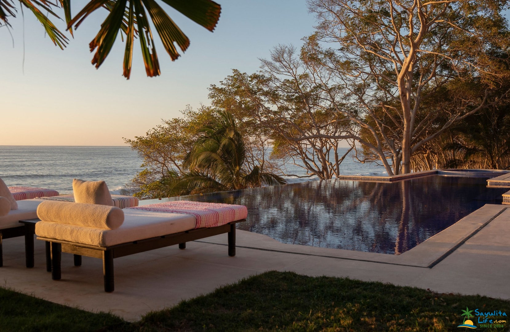 Casa Mis Amores has four bedrooms in the main villa, three private bungalows, and sleeps up to fourteen people. Some amenities include an infinity swimming pool with a cascading waterfall leading down to the pathway to the beach, sauna, steam room, tennis court, as well as surfboards, and other toys for water sports. The property is kid and pet friendly, and has a small playground, trampoline, big tv-room, large chess set, and a charming garden that produces some of the fruits and vegetables consumed on-site.